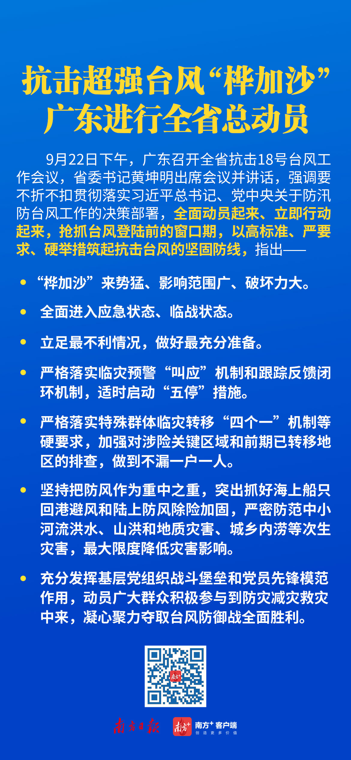 今年第18号台风“桦加沙”已加强为超强台风级,正在趋向广东沿海,将对我省造成大范围严重风雨影响。9月22日下午,省委、省政府召开全省抗击18号台风工作会议,进一步分析研判台风发展态势,对全省防御工作进行再部署、再推进、再落实。省委书记黄坤明出席会议并讲话,强调要不折不扣贯彻落实习近平总书记、党中央关于防汛防台风工作的决策部署,全面动员起来、立即行动起来,抢抓台风登陆前的窗口期,扎实有力、高质高效做好各项防御应对准备,以高标准、严要求、硬举措筑起抗击台风的坚固防线,全力守护好人民群众生命财产安全和社会大局稳定。省委副书记、省长王伟中主持会议,省委副书记、深圳市委书记孟凡利出席会议。